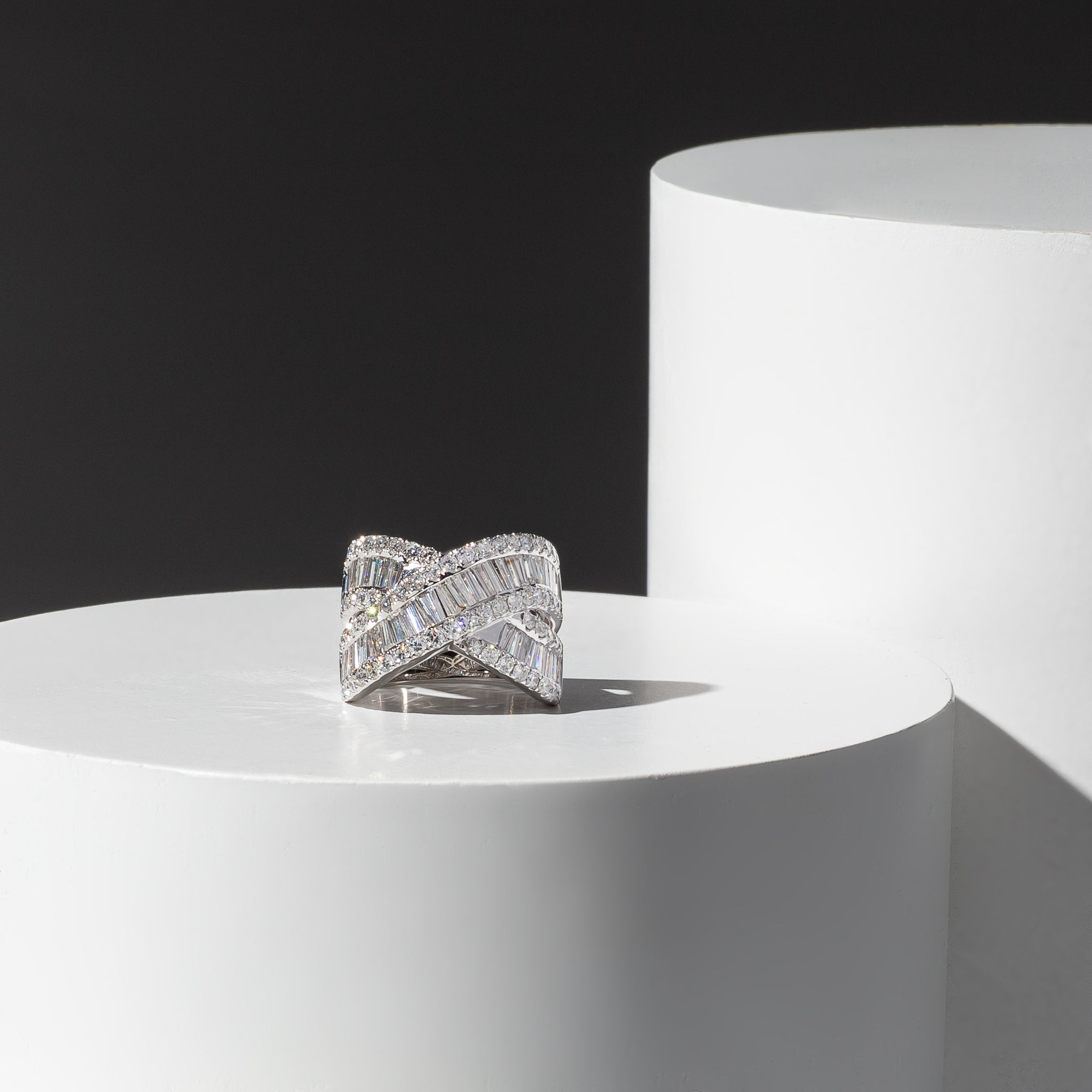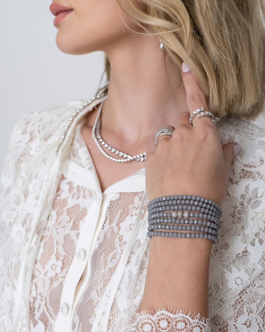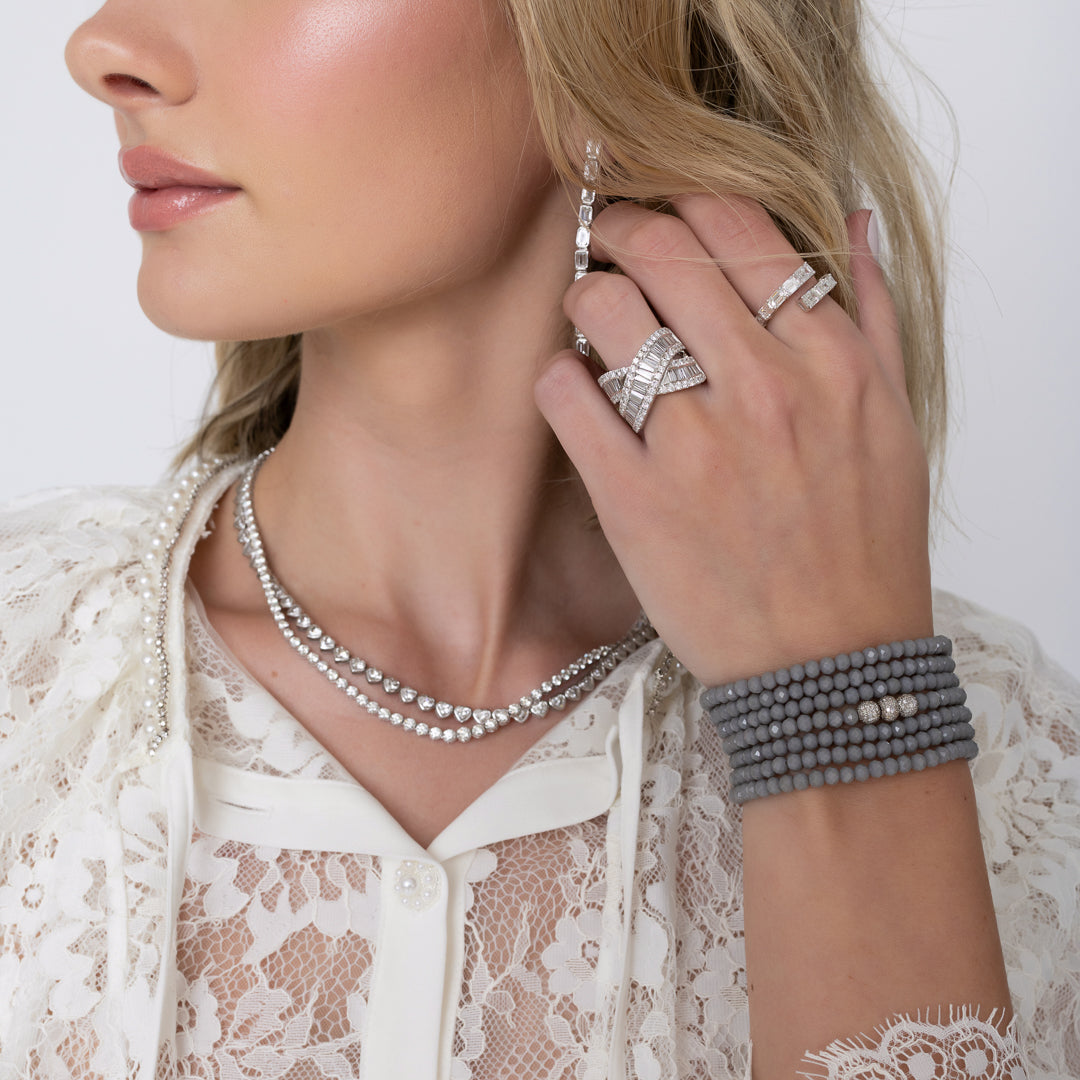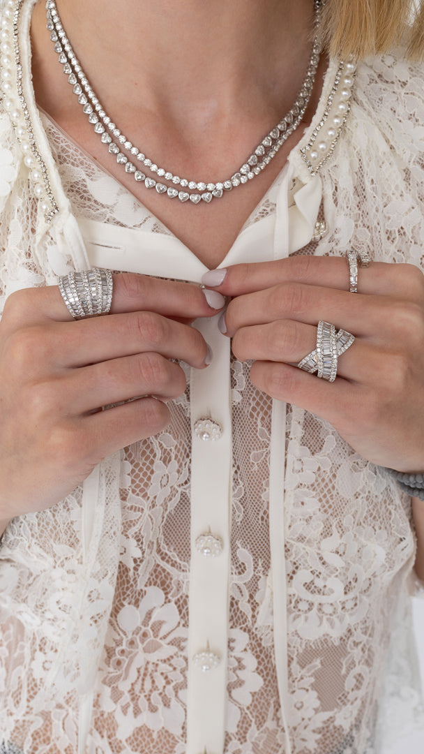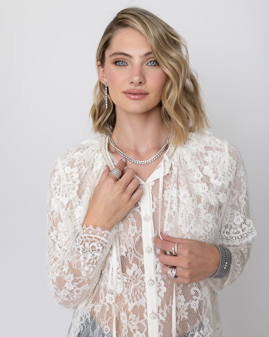 This month’s edit, The Lace Theory, captures the essence of an airy spring breeze, centered around Rachel’s favorite fabric: lace. We styled delicate layers of lace with white gold and diamonds, creating a thoughtful balance of feminine textures and fresh pops of white. Our favorite RLC tennis necklaces and bold diamond cocktail rings are paired with a lace button-up for a soft yet striking statement. The look is finished with dark denim and a neutral gray Seven Wrap, bringing a modern, everyday ease to the look.